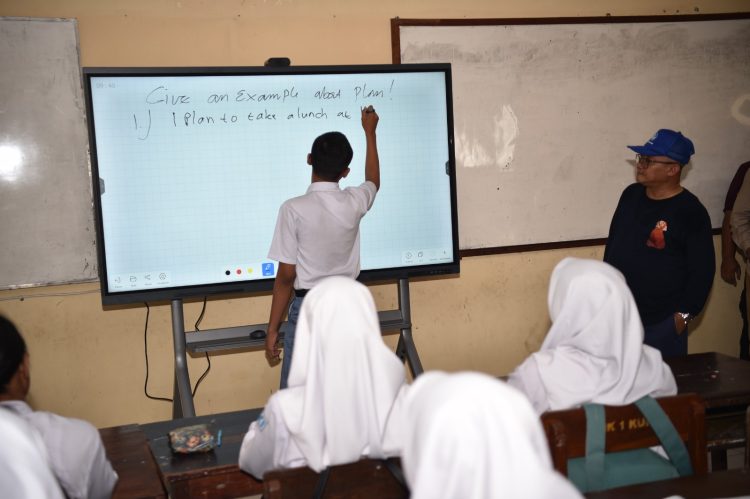 Tak ketinggalan, murid Kelas XII jurusan MPLB 1, Muhammad Aflah Hilmanunulya, turut membagikan testimoni. “Dengan menggunakan papan interaktif, materi Bahasa Inggris dari Bapak Basuki menjadi lebih menyenangkan. Semoga kelas lain juga mendapat kesempatan yang sama memilki alat bantu ini (IFP),” tutur Aflah.