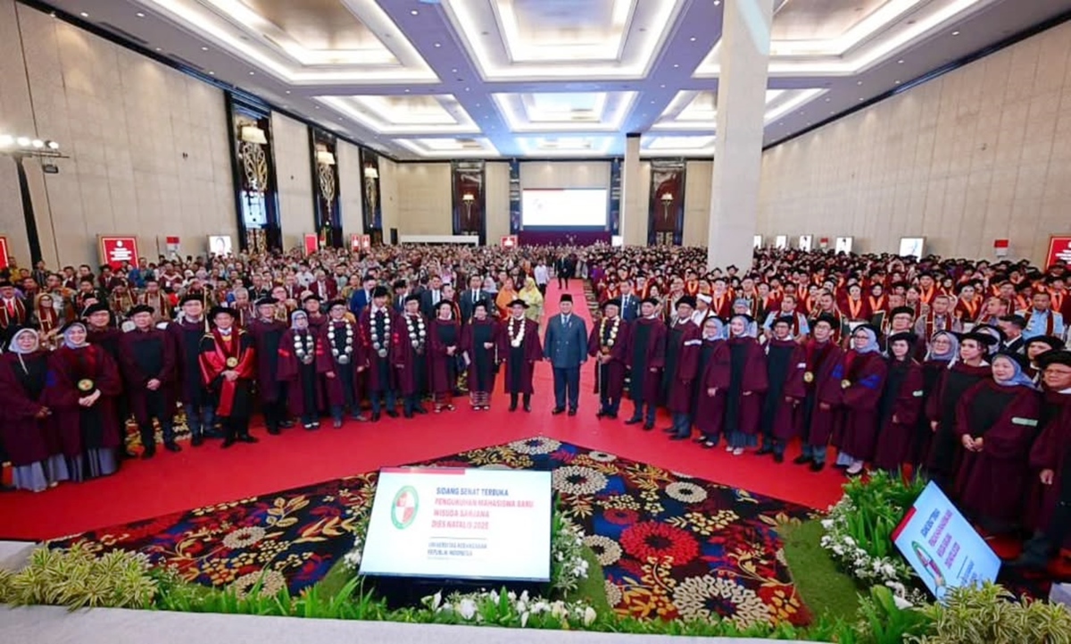 Presiden Prabowo tiba sekitar pukul 10.40 WIB, tampil berwibawa mengenakan jas abu-abu dan celana hitam. Kedatangannya disambut tepuk tangan meriah dari para wisudawan, keluarga, dan tamu undangan yang memenuhi ruangan.