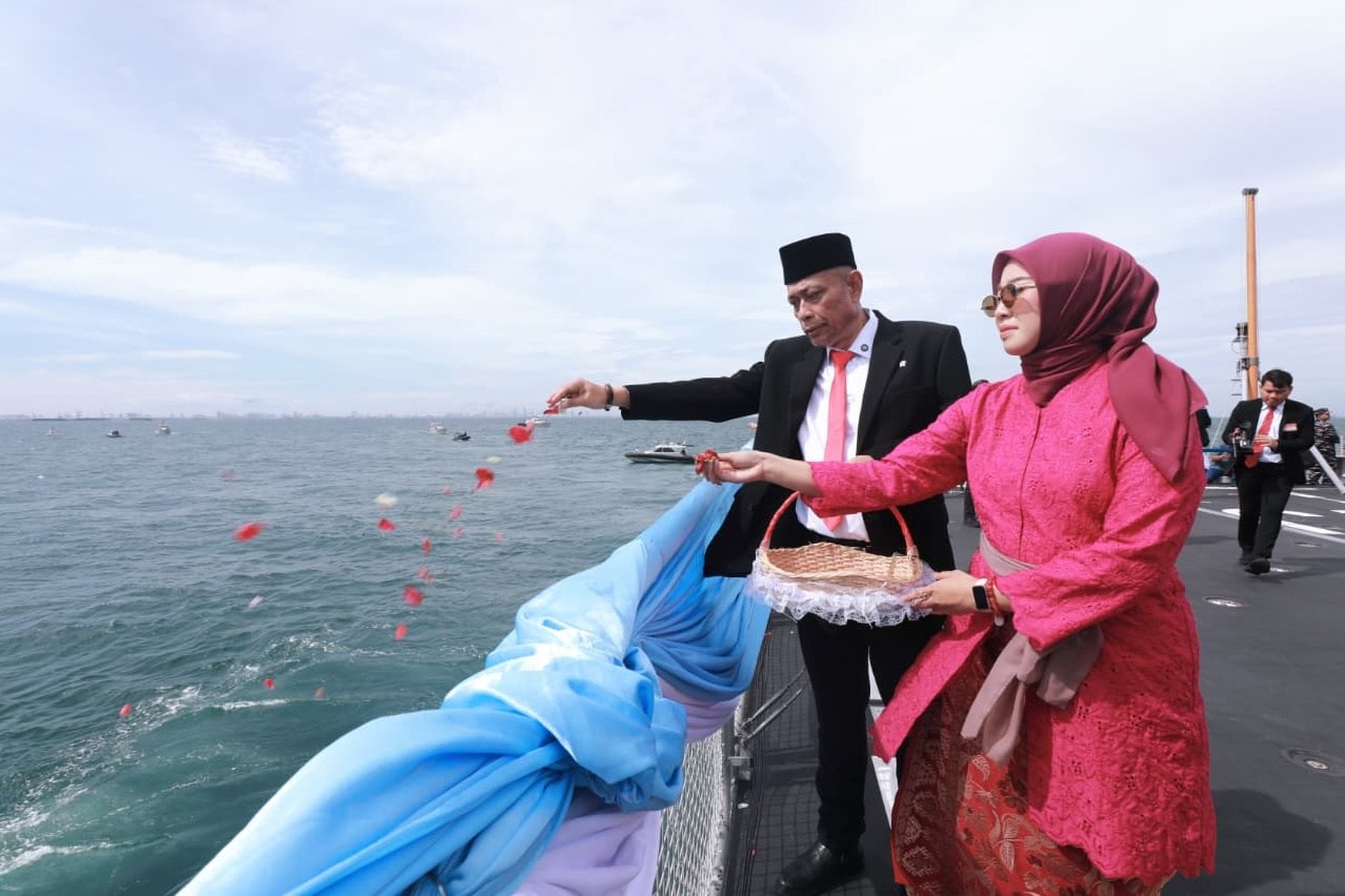 Kementerian Sosial (Kemensos) bersama Tentara Nasional Indonesia Angkatan Laut (TNI AL) menggelar Upacara Tabur Bunga di laut dalam rangka memperingati Hari Pahlawan Nasional 2025. Upacara berlangsung khidmat di atas geladak KRI Brawijaya (320) yang berlayar di perairan Teluk Jakarta, Senin (10/11/2025).