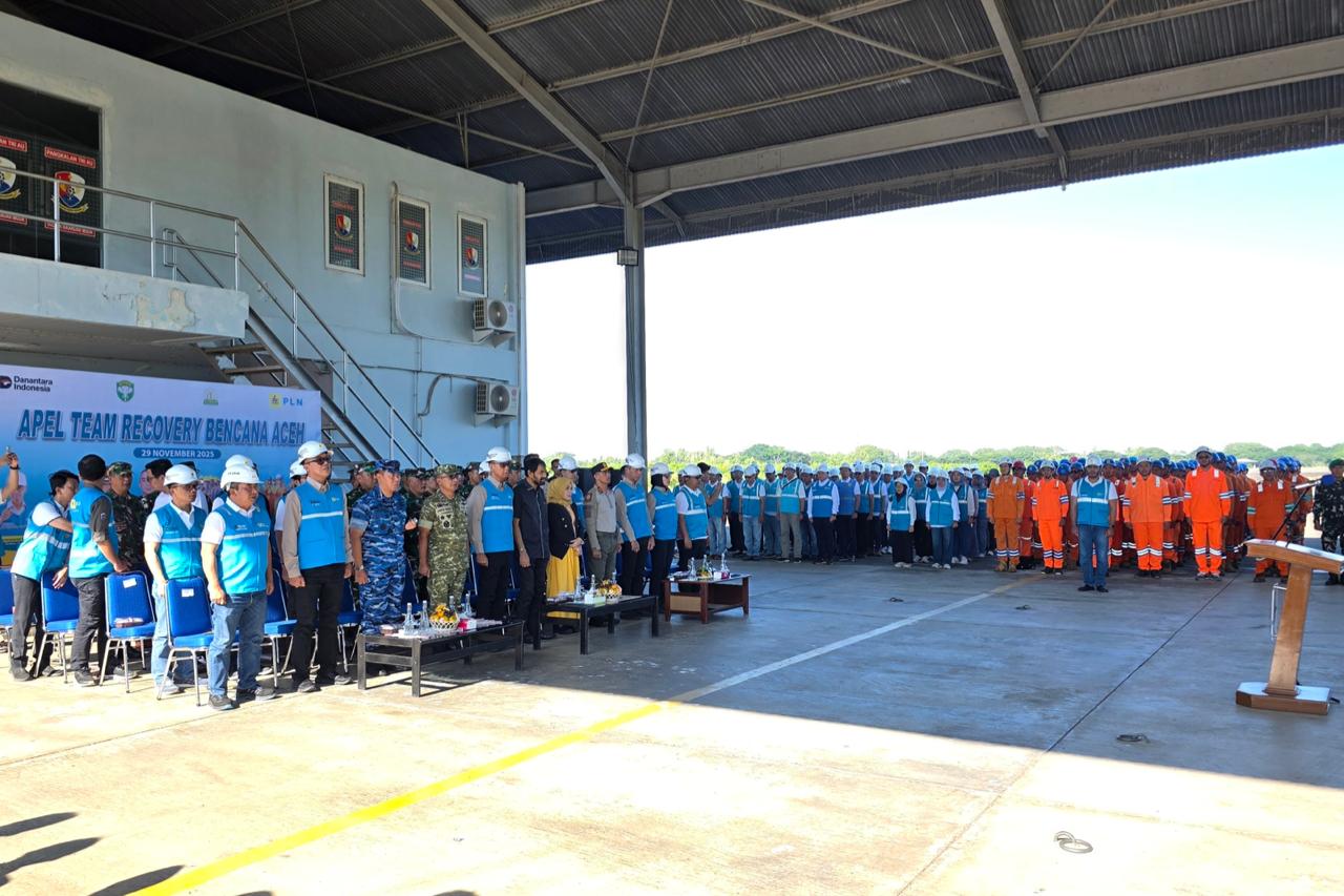Pelepasan tim dilakukan dalam Apel Siaga Team Recovery Bencana Aceh di Landasan Udara Sultan Iskandar Muda, Sabtu (29/11/2025).