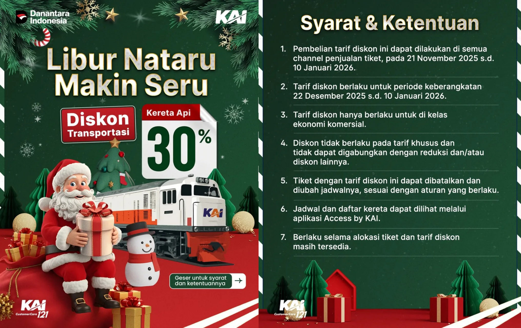 Jakarta, Kabariku – Jelang musim libur Natal dan Tahun Baru (Nataru) 2025/2026, PT Kereta Api Indonesia (KAI) meluncurkan promo spesial berupa potongan harga 30% untuk pembelian tiket kereta api.