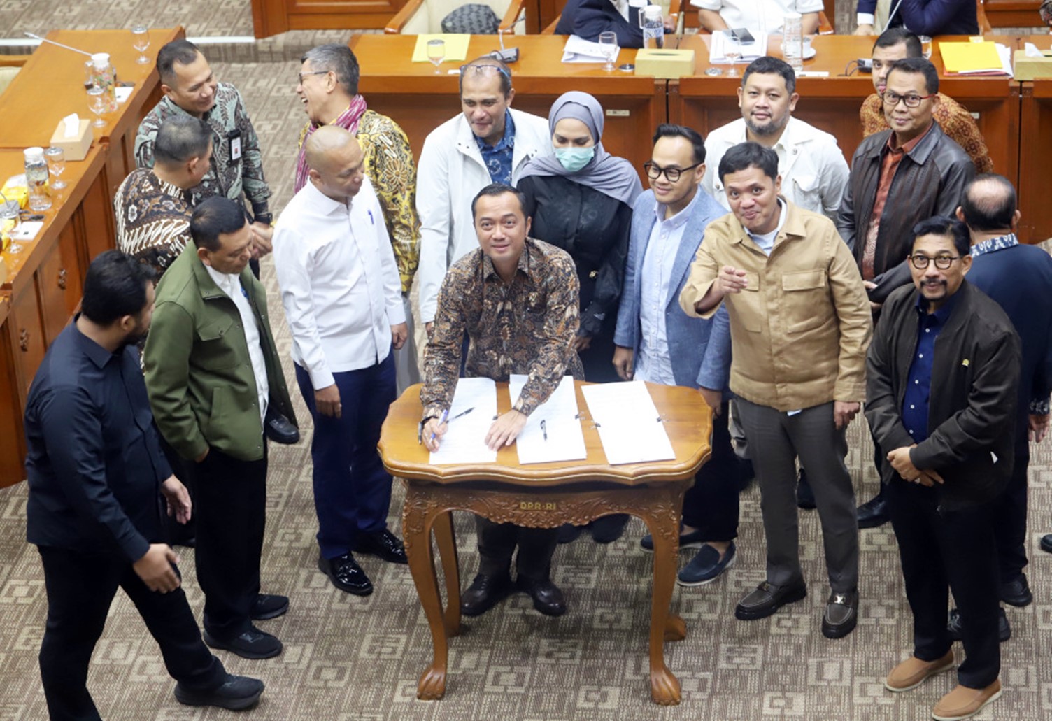 Sebelumnya, Menteri Sekretaris Negara (Mensesneg) Prasetyo Hadi, Wakil Menteri Sektretaris Negara (Wamensesneg) Bambang Eko Suhariyanto, Wakil Menteri Hukum (Wamenkum) Edward Omar Sharif Hiariej, Ketua Komisi III DPR Habiburokhman, Wakil Ketua Komisi III DPR Mohammad Rano Alfath dan Sari Yuliati, serta sejumlah anggota Komisi III DPR menandatangani berita acara persetujuan tingkat I terhadap revisi Undang-Undang (RUU) tentang Perubahan atas Nomor 8 Tahun 1981 tentang Kitab Undang-Undang Hukum Acara Pidana (KUHAP), di Ruang Komisi III DPR, Kompleks Parlemen, Senayan, Jakarta, Kamis (13 November 2025).