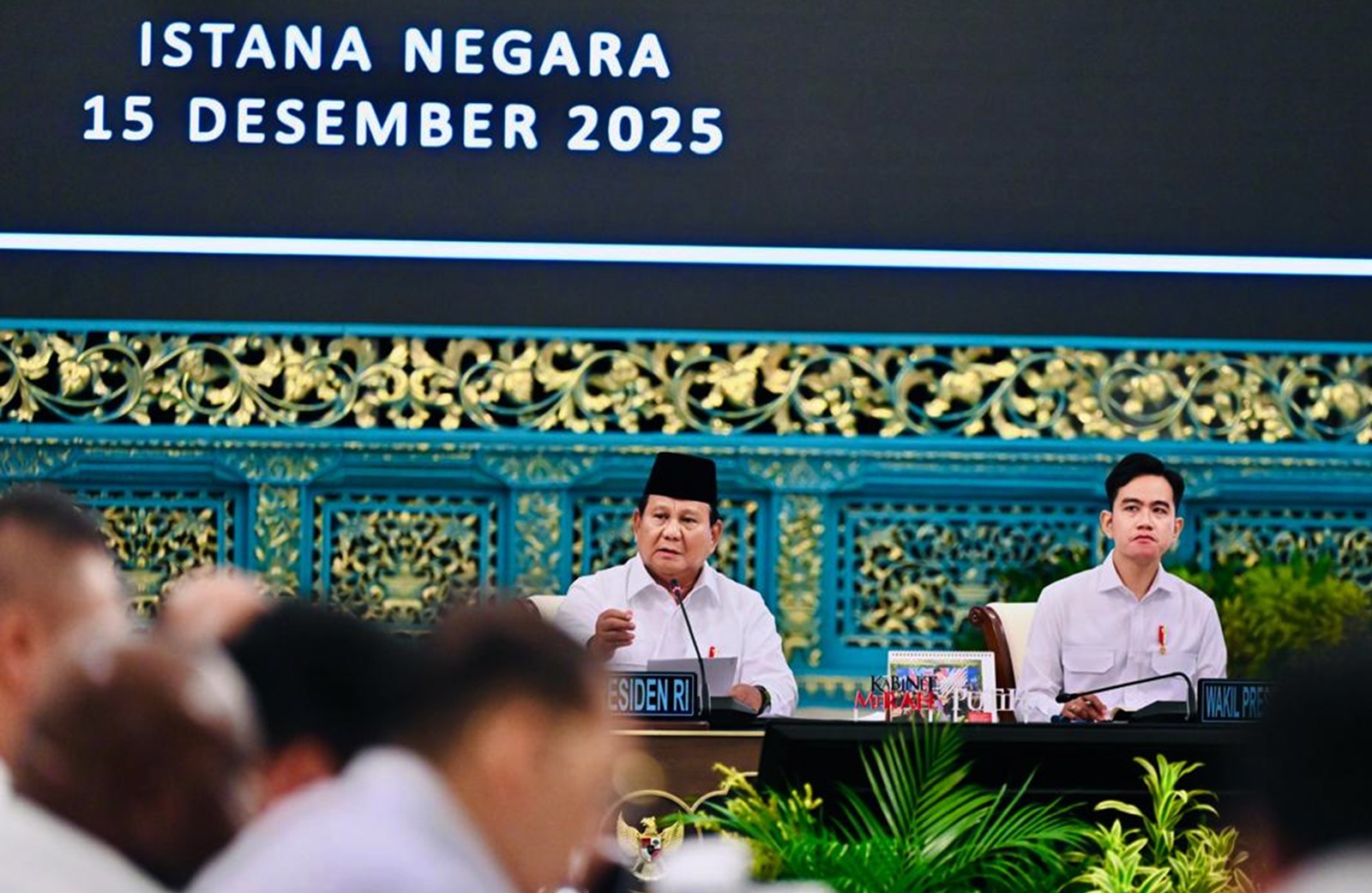 Jakarta, Kabariku -Presiden Republik Indonesia Prabowo Subianto didampingi Wakil Presiden Gibran Rakabuming Raka memimpin Sidang Kabinet Paripurna di Istana Negara, Jakarta, Senin (15/12/2025).