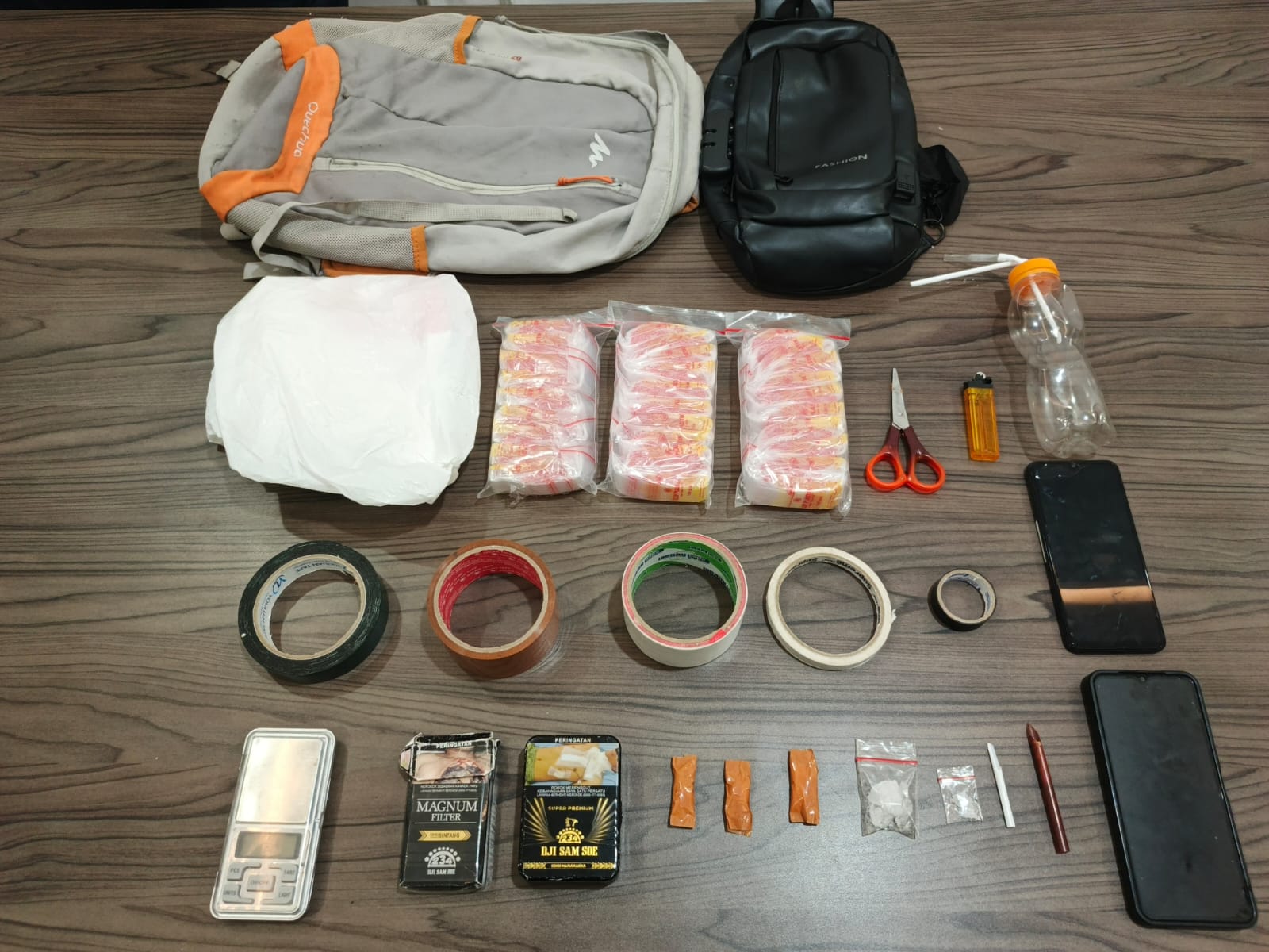Dari hasil penggeledahan, petugas berhasil mengamankan sebanyak 5 paket narkotika yang diduga jenis sabu dengan berat bruto 5,55 gram dan berat netto 4,87 gram. Selain itu, turut diamankan sejumlah barang bukti lainnya berupa timbangan digital, alat hisap (bong), plastik klip, lakban, gunting, dua unit telepon genggam, serta perlengkapan yang diduga digunakan untuk menimbang dan mengemas sabu.