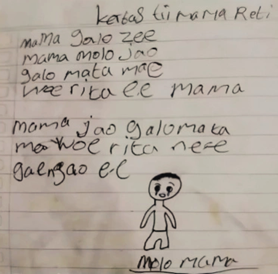 Mama jao Galo Mata, Mae woe Rita ne’e gae ngao ee (Mama saya meninggal, jangan menangis juga jangan cari saya ee)