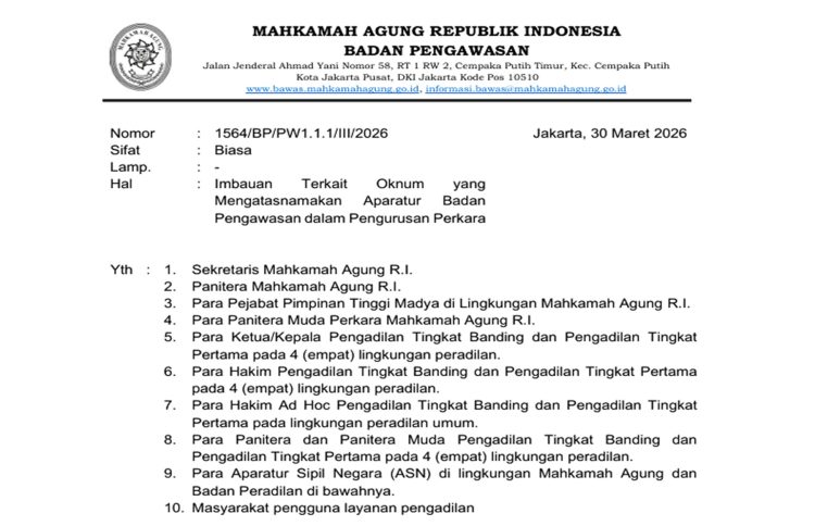 Jakarta, Kabariku – Badan Pengawasan (Bawas) Mahkamah Agung (MA) mengeluarkan imbauan resmi terkait maraknya oknum yang mengatasnamakan aparatur Bawas dalam pengurusan perkara. Imbauan ini disampaikan melalui surat nomor 1564/BP/PW1.1.1/III/2026 yang diterbitkan pada Senin, 30 Maret 2026.