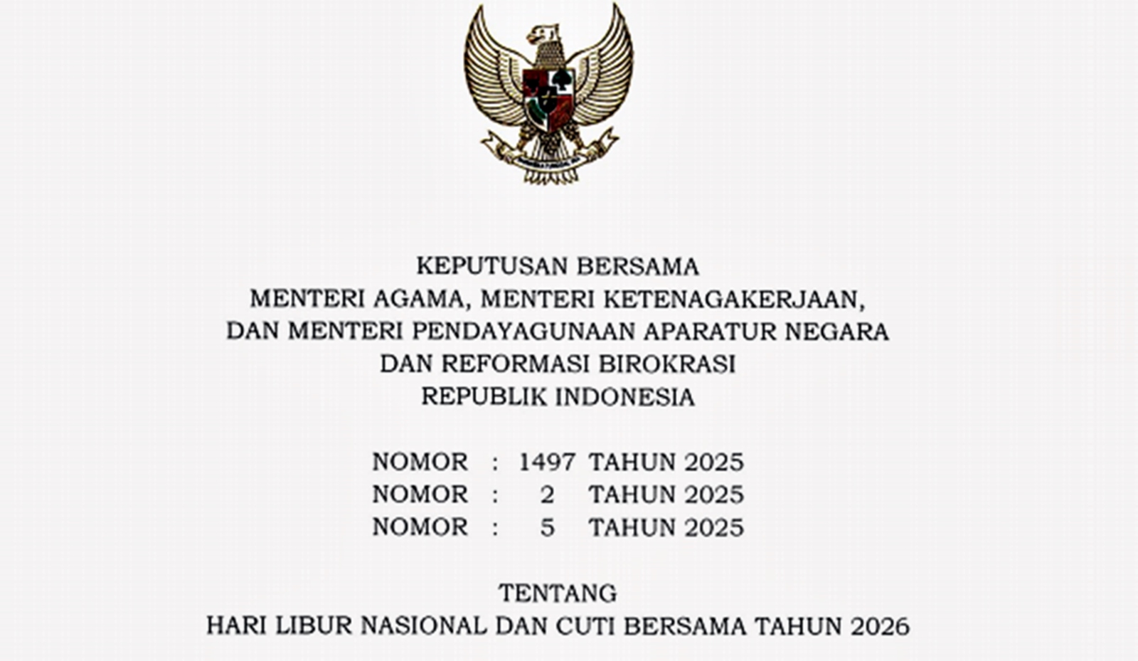 Jakarta, Kabariku – Pemerintah resmi menetapkan jadwal libur nasional dan cuti bersama untuk perayaan Idulfitri 1447 Hijriah pada tahun 2026. Ketentuan tersebut tertuang dalam Surat Keputusan Bersama (SKB) Tiga Menteri yang ditandatangani oleh Menteri Agama, Menteri Ketenagakerjaan, serta Menteri Pendayagunaan Aparatur Negara dan Reformasi Birokrasi.