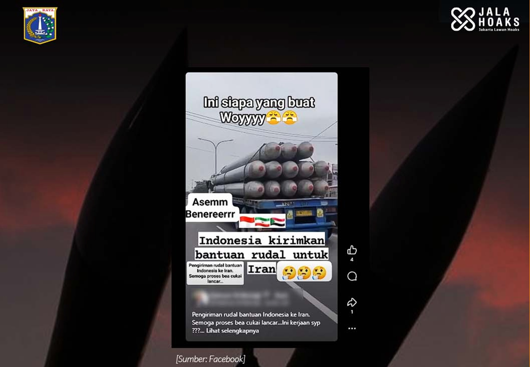 “Klaim mengenai Indonesia mengirimkan bantuan rudal untuk Iran adalah tidak benar. Benda dalam video tersebut merupakan material konstruksi berupa paku bumi,” tegas Tim Jalahoaks.*