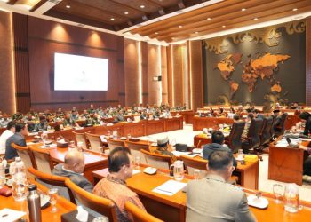 Menteri Pertahanan (Menhan) RI Sjafrie Sjamsoeddin didampingi Panglima TNI Jenderal TNI Agus Subiyanto dan Kepala Staf Angkatan menghadiri Rapat Kerja...