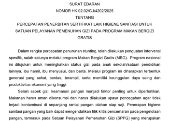 Baca lagiKementerian Kesehatan (Kemenkes) menerbitkan Surat Edaran Nomor HK.02.02/C.I/4202/2025 tentang Percepatan Penerbitan Sertifikat Laik Higiene Sanitasi (SLHS) bagi Satuan Pelayanan Pemenuhan...